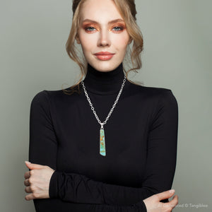 Experience the stunning beauty of Pueblo Blue Turquoise and Sterling Silver Necklace, featuring genuine turquoise inlaid in a hand-crafted sterling silver bezel. This necklace is adjustable up to 17" in length, with a pendant measuring 2.5" from bale and .4" at its widest point. The perfect blend of vibrant blue turquoise and shimmering silver, this necklace weighs 20 grams and is truly one-of-a-kind. Crafted with care and finished by hand, this piece is a must-have for any jewelry collection.