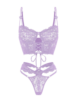 Embrace elegance in this lavender lace lingerie set, featuring 3D floral embroidery and pearl accents. The lace-up bralette and matching panties offer a romantic touch with satin ribbons, perfect for bridal nights, anniversaries, or special moments.