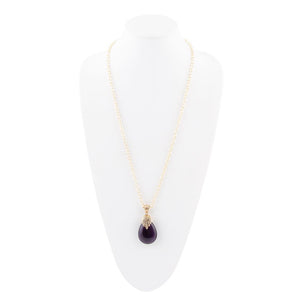 Experience expert craftsmanship with this handcrafted and finished necklace featuring a stunning 31.5" golden bronze chain and a teardrop pendant made of purple quartz and detailed with golden bronze that measures 2.63" long and has a widest point of 1.25". With a lobster clasp and a total weight of 62.7g, this necklace is sure to make a bold statement.