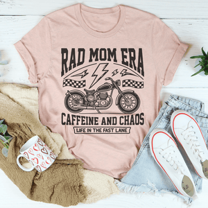 Product Title: Women's Statement T-Shirt - "Rad Mom Era: Caffeine and Chaos"