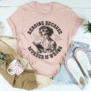 Dive into your next adventure with our "Reading Because Murder Is Wrong" T-shirt. This witty top is perfect for book lovers with a dark sense of humor and a passion for mystery novels. It's a fun way to show off your love for reading while playfully acknowledging your escape from reality.