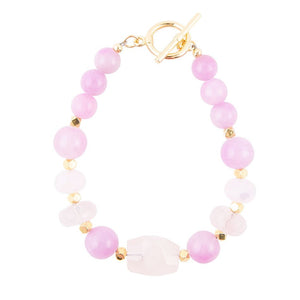 This beautiful Rose Jade Toggle Bracelet features genuine lilac jade, rose quartz, and lilac crystal, all carefully handcrafted and finished for a one-of-a-kind piece. The gold-plated brass adds a touch of luxury, while the toggle closure ensures a secure fit. Add a pop of pink to your outfit with this 7.5" long, 24-gram bracelet.