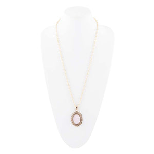 Discover the beauty of the Rosie Pink Opal Pendant Necklace! Handcrafted with a genuine pink opal in a bronze bezel, its golden bronze chain is adjustable up to 32". Weighing at 1.58 oz, the pendant hangs 2.25" from a bale and is 1.4" in width. Embrace the charming colors of pink and gold and add a touch of elegance to any outfit.