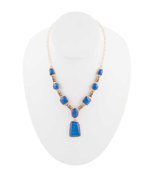 Individually crafted by hand using golden bronze, this stunning pendant necklace features genuine blue lapis stones. It measures 17.75" long and has a classic link closure. The hanging pendant is 2" long and 0.87" wide at its widest point, adding a touch of elegance to any outfit. It has a total weight of 36.75g, making it a substantial and eye-catching piece.