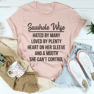 Introducing the ultimate declaration of boldness: the "Sasshole Wife hated by many loved by plenty heart on her sleeve and a mouth she can't control" T-shirt. This tee is a tribute to the women who walk the fine line between sass and class, loved for their unfiltered honesty and fierce loyalty. It's for the fearless, the outspoken, and the undeniably genuine.