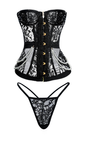 This captivating design features intricate black lace, gold button accents, and delicate pearl drapes for a touch of luxury. The structured corset silhouette sculpts your waist while the sheer mesh panels add an irresistible allure.