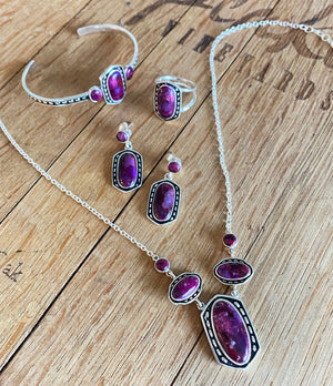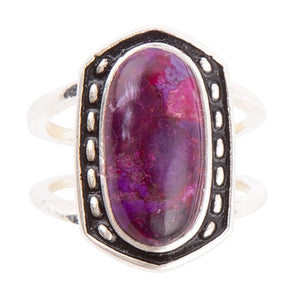 Brighten your day with this magnificent Shielded Purple Turquoise and Sterling Silver Ring! Handcrafted with genuine Sterling Silver and Purple Turquoise, this beautiful piece is sure to draw admiring glances. With its glimmering .75" x .5" bezel, it's the perfect addition to your jewelry collection! The total weight is approximately 3.4 grams and the bottom bands are 7mm in width. Natural variances are part of the beauty of our genuine stones. Your piece will vary slightly from the image shown.