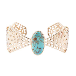 Feel the power of nature with Skyler Turquoise Cuff Bracelet! This uniquely designed open cuff is crafted and finished by hand, resulting in a striking, high polish bronze bezel for an exquisitely turquoise stone center. It fits most wrists, with a gentle squeeze and stretch that weighs just .79 oz. Elevate your look and feel confident with Skyler! 💎💛