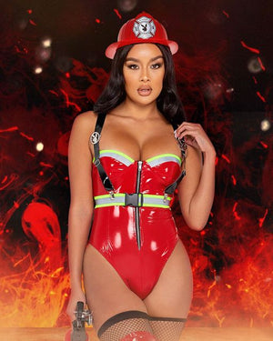 Is it hot in here, or is it just this outfit? The 3PC Playboy Smokin’ Hot Fire Girl ensemble is the perfect costume for a rave, Halloween party, or some smoking-hot roleplay. The focal point of this outfit is the stretch vinyl bodysuit with zipper closure. The supportive and flattering curve of the bodice emphasizes your bust, while the cheeky cut in the back flaunts your buttocks. The sheen of the bright red vinyl and the reflective trim at the tops of the bodice cups are a perfect replica of a classic fireman outfit—with a heaping helping of the sex appeal, of course.