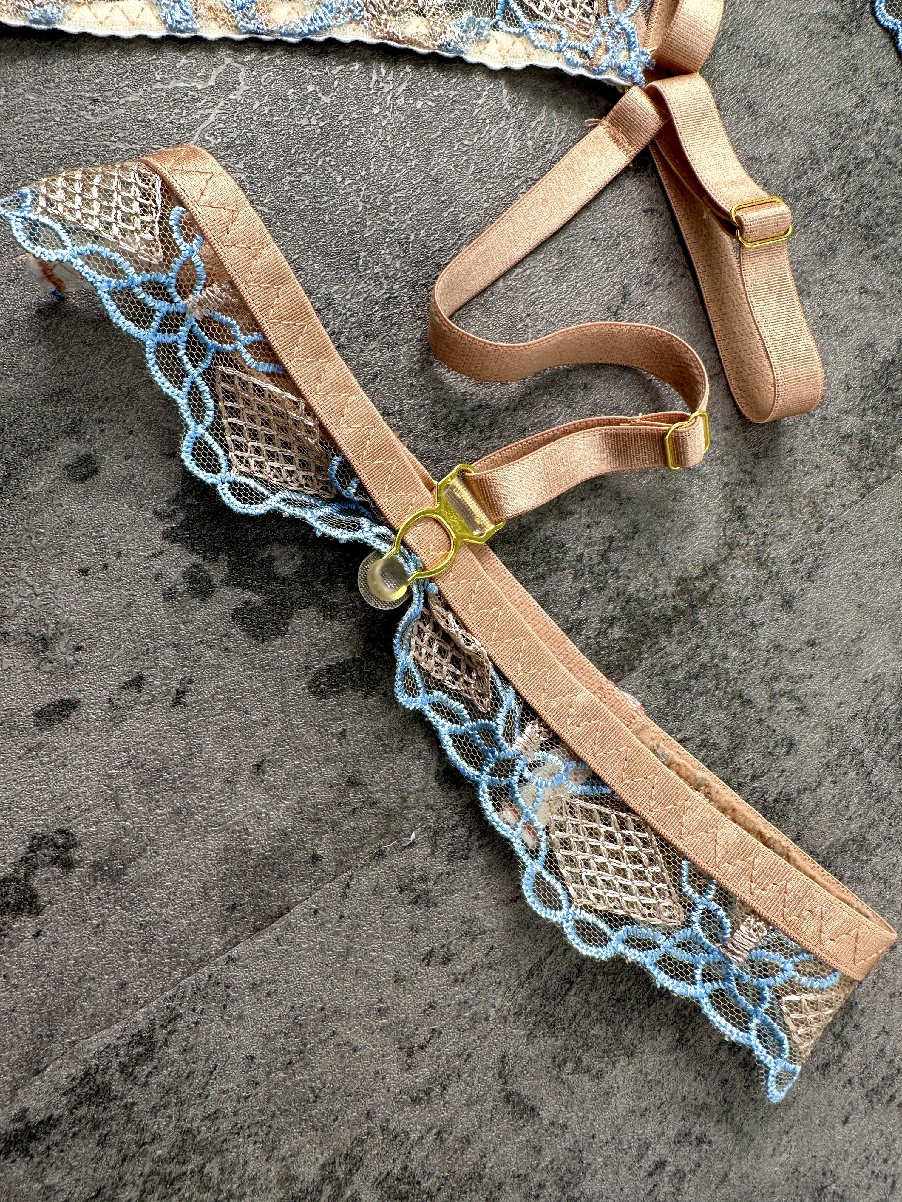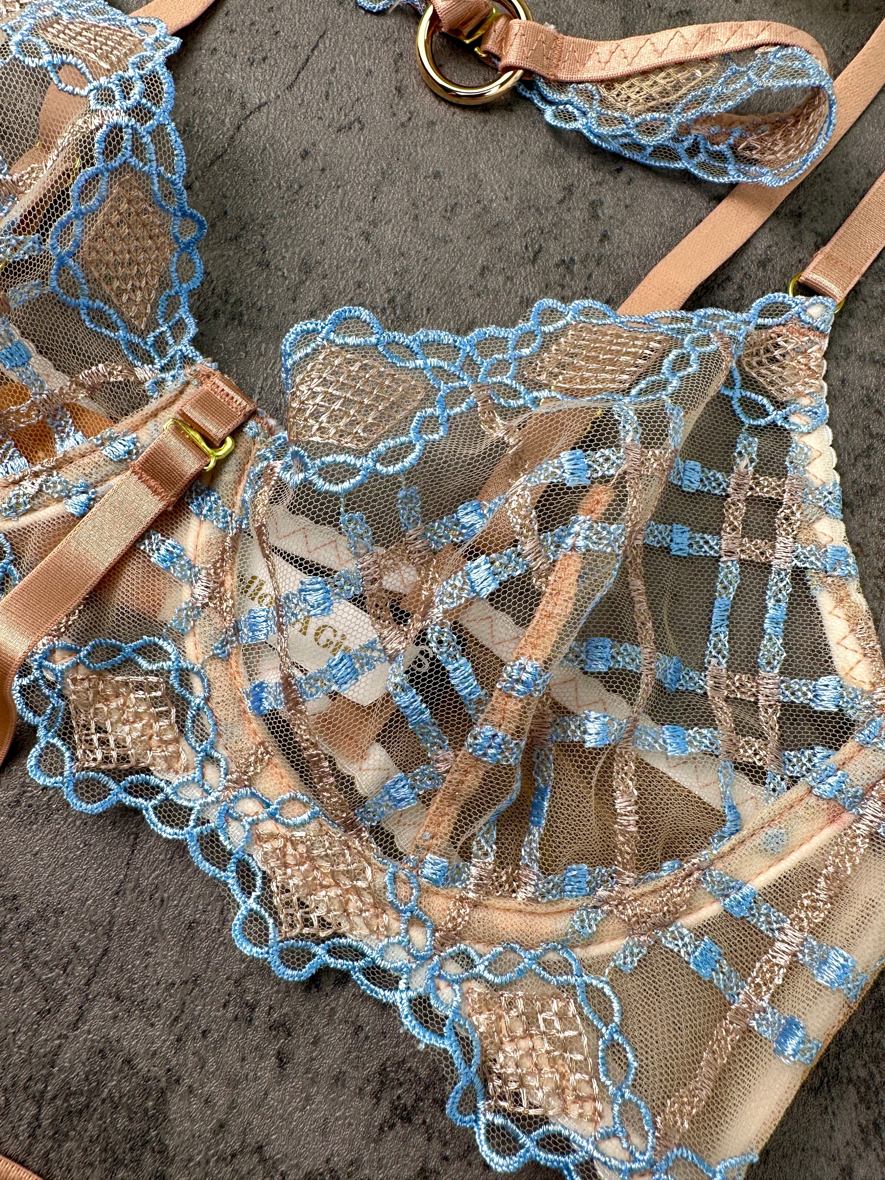 Turn heads in this bold and chic 4-piece lingerie set featuring a plaid mesh design with delicate blue lace trim. The set includes a wired bra, strappy thong, adjustable harness, and matching choker for a daring, coordinated look. With its gold-tone ring details and figure-enhancing straps, this set is designed to accentuate every curve while blending playful patterns with seductive elegance.