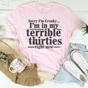 Introducing our playful statement tee, the "Sorry I'm Cranky, I'm In My Terrible Thirties Right Now"! Specially designed for those traversing the treacherous path of their thirties, this shirt is your fun-loving armor.