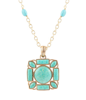 Elevate your style with our Squared Up Green Turquoise Pendant Necklace! Crafted by hand, this unique piece features genuine green turquoise stones in high polish bronze bezels, complete with a golden bronze chain. Adjustable up to 29", this 1.3" pendant adds a touch of elegance and weighs only 29 grams.