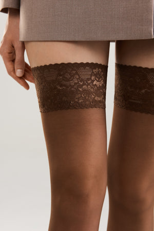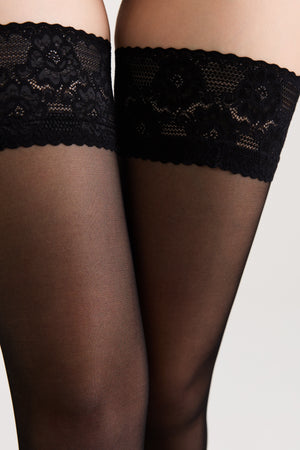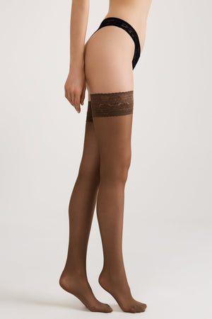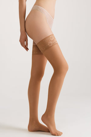 Comfortable stockings with a wide lace band. CLASS stockings are soft and smooth, ideal for both warm and cloudy days. Their sheer coverage enhances the slimness of your legs, while the lace elastic band adds confidence and elegance. The medium-width band fits securely around the thighs without slipping or pinching. Reinforced toe for added durability.