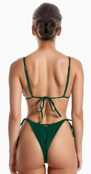 This sexy string bikini features a triangle bikini top wit a tie neck and tie back, and a matching cheeky back bikini bottom with side ties.