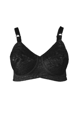 The Rago Lacette Satin and Lace Wireless Support Bra 2101 supports and shapes the breasts with fiber filled, lined, seamed wireless cups. Features beautiful floral lace, non-stretch straps and tall sides with boning. Rago's Lacette Satin and Lace Wireless Support Bra is made of nylon/spandex.