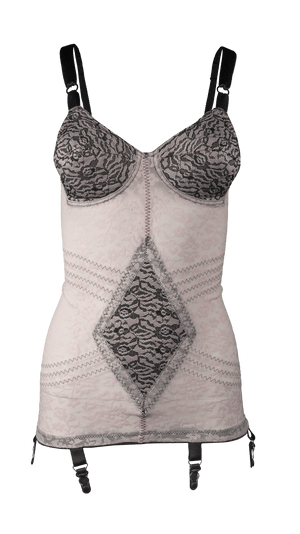 This white lace open bottom body briefer features power-net lace, exclusive contour bands and metal garters for comfort and fit. This lacette jacquard knit fabric is made of 70% nylon, 30% Invista® Lycra® with two-way stretch in a special lace floral design.