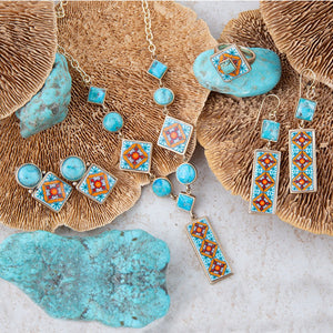 Experience the vibrant colors and Latin-inspired design of these Talavera Tile Turquoise Drop Earrings. Each earring features a .5 inch wide spherical turquoise stone set in a bronze bezel, creating a unique and eye-catching piece. With a length of 1.5 inches from sterling silver post and a weight of 10 grams, these earrings are both lightweight and impactful. Add a touch of energy and passion to your style with these stunning earrings. Crafted and finished by hand.