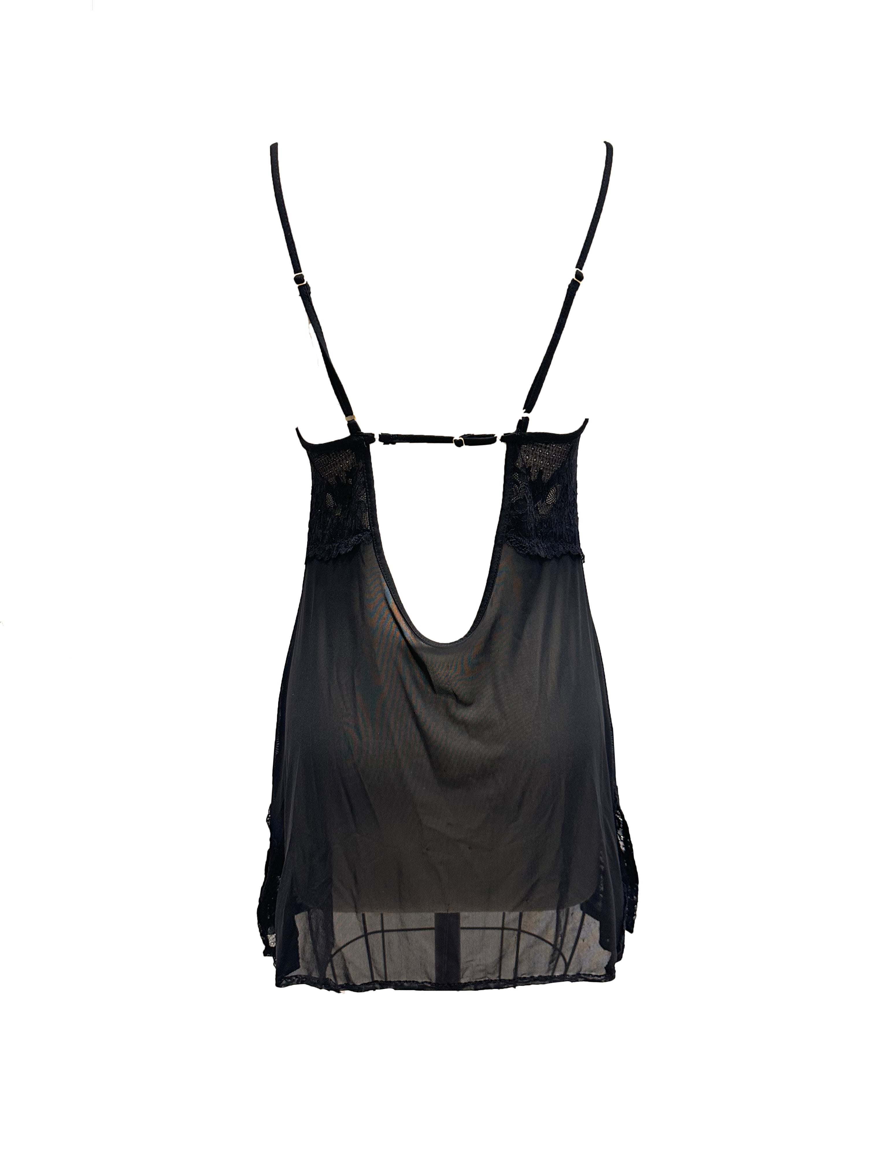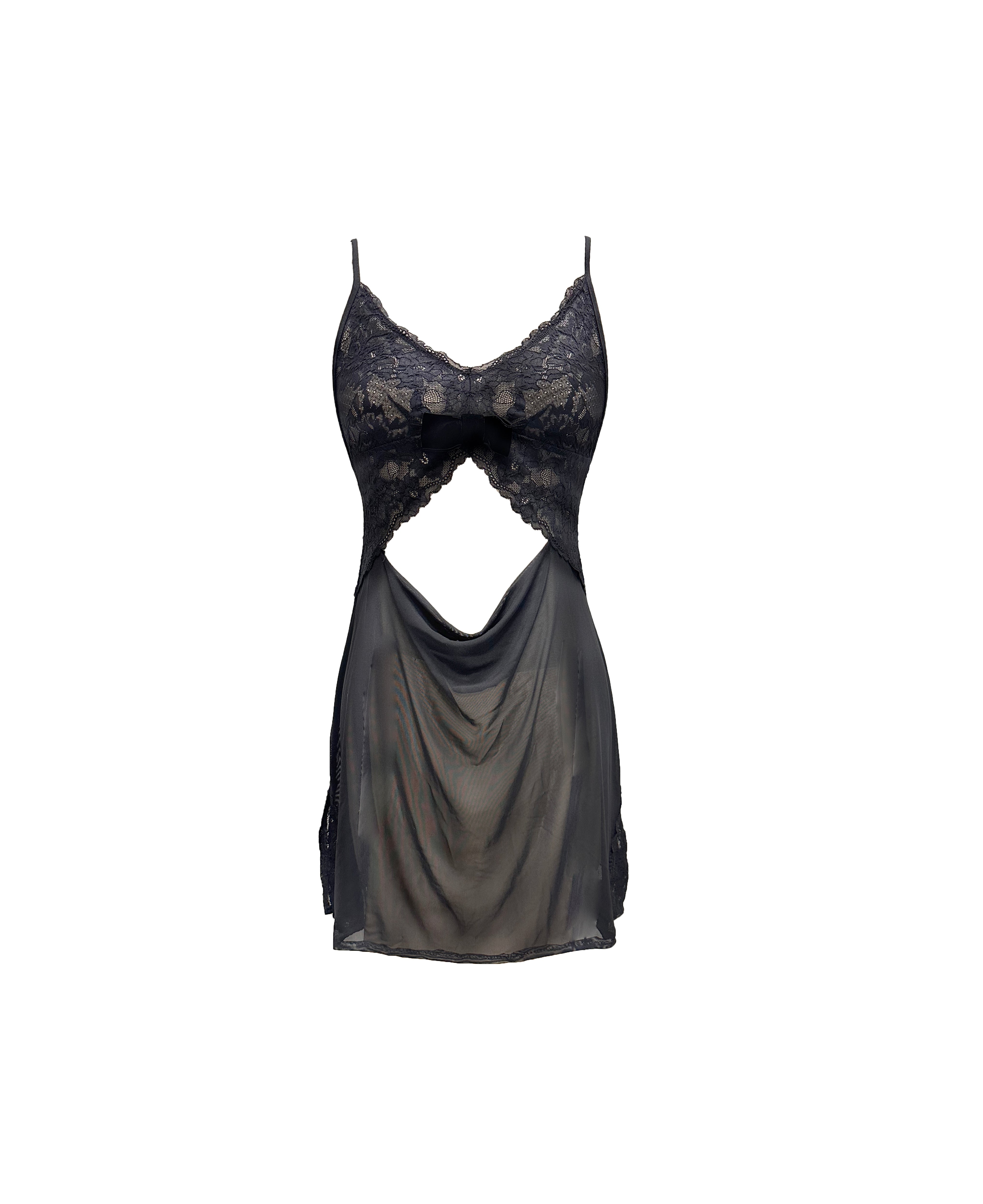Expertly crafted from semi-sheer mesh and stretch lace, this short nightie combines luxury with seduction. The cowl draped detail at the front adds a touch of elegance, while the cut-out detail at the midriff and bow at the center front add a playful element. With adjustable straps and side slits, this nightie offers both comfort and allure.