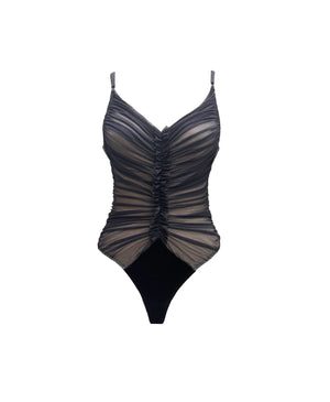 Expertly designed for a flawless look, the Terminator Tulle Ruched Bodysuit is constructed with luxurious soft stretch tulle and features a V neck and front frou frou detail. The garment is entirely lined with nude mesh and includes a velvet inner thigh detail. With adjustable straps and a thong back, this bodysuit offers a flattering fit for any body type.