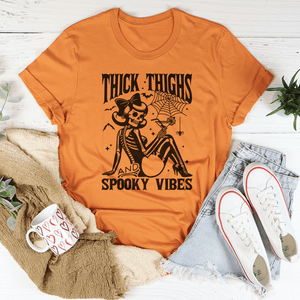 Step into the spooky season with flair and a flash of confidence in this fun women's T-shirt boasting, "Thick Thighs And Spooky Vibes." It's the perfect choice for those who celebrate their curves and love all things Halloween.