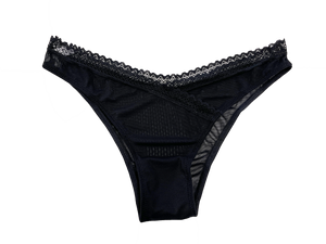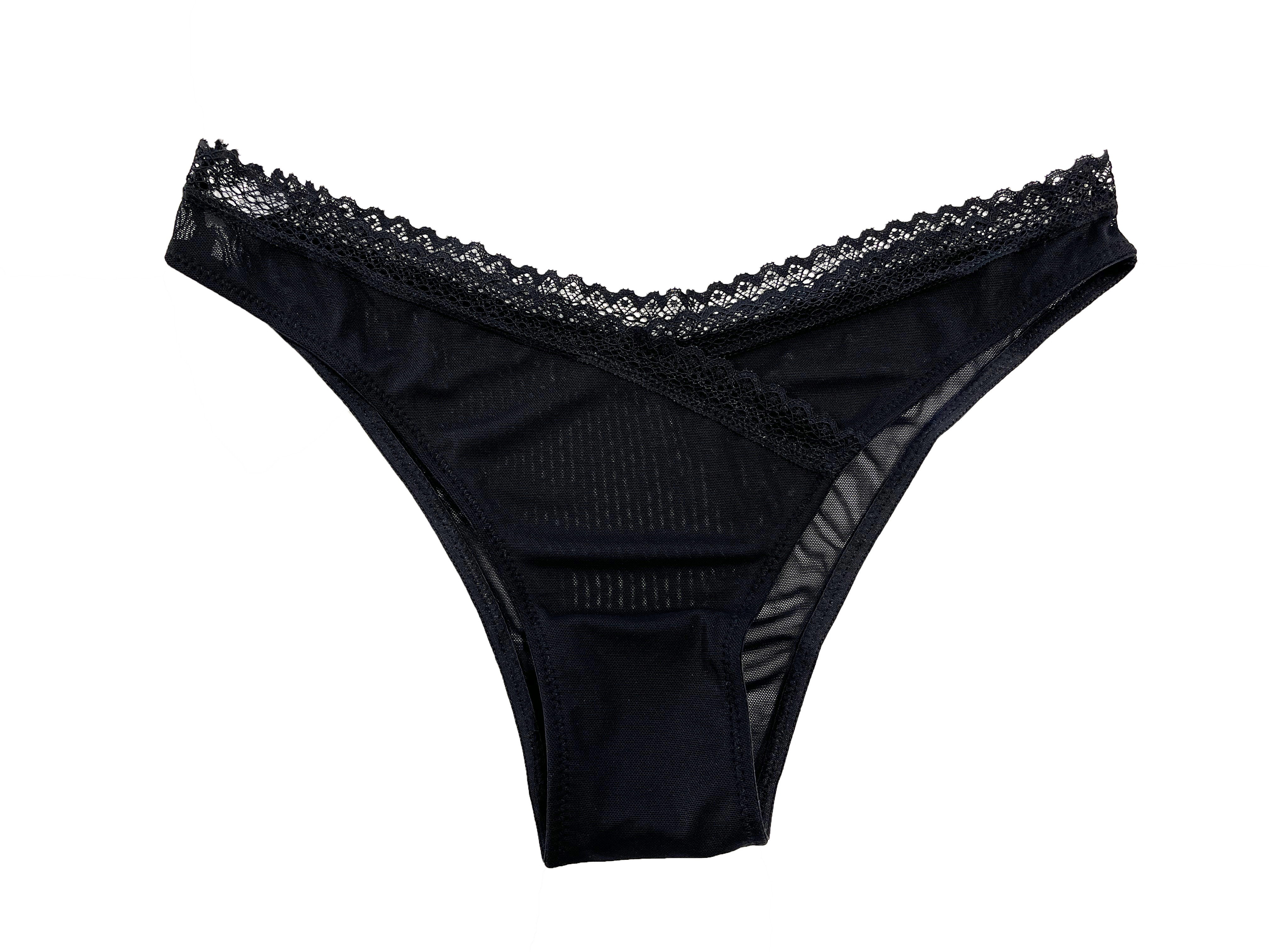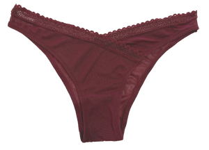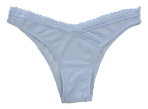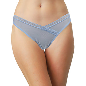 Pretty mesh cheeky with V front lace trim. XS-2X. Available in blue, fig, and black.