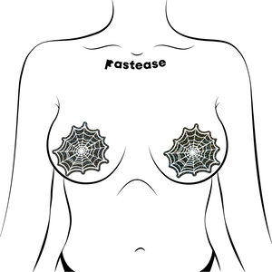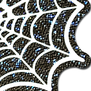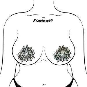 Introducing our Glitter Black Glow in the Dark Spooky Spider Web Nipple Covers by Pastease® - the perfect accessory for adding a touch of eerie charm to your Halloween costume! Crafted from luxuriously soft glitter material, these pasties offer both comfort and style. Here's why they're a must-have: