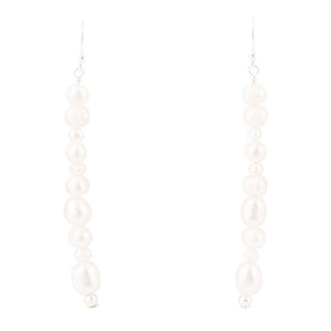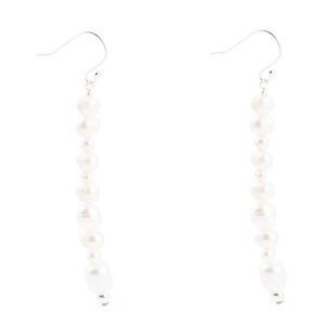Picture a pair of linear pearl earrings, each delicate strand gracefully cascading from a sterling silver base. The luminous pearls, arranged in a linear fashion, evoke a sense of timeless elegance and sophistication. With each movement, the pearls sway gently, reflecting light and casting a radiant glow. These earrings are a modern interpretation of classic pearl jewelry, perfect for adding a touch of refinement to any ensemble, from casual chic to formal elegance.
