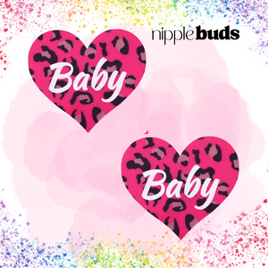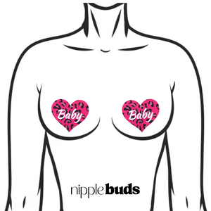 Pink heart nipple pasties with leopard-print “Baby” text — perfect for lingerie looks, baddie cosplay, and unapologetic brats.