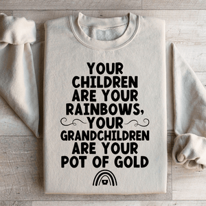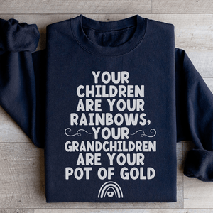 The sweatshirt features the touching phrase "Your Children Are Your Rainbows, Your Grandchildren Are Your Pot Of Gold" in a warm, inviting font, symbolizing the treasure of family connections and the colorful joy children and grandchildren bring into life. It's a beautiful way to express your love and appreciation for your family, adding a touch of sentimentality to your outfit.