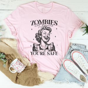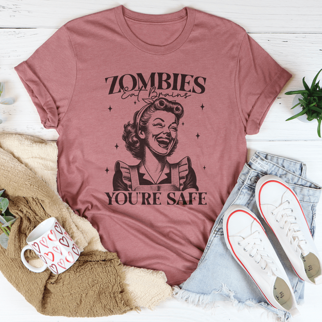 Stay safe and stylish with this playful women's T-shirt boasting the humorous slogan, "Zombies Eat Brains, You're Safe." It’s the perfect addition for anyone who enjoys a bit of zombie humor mixed with a dash of cheeky confidence.